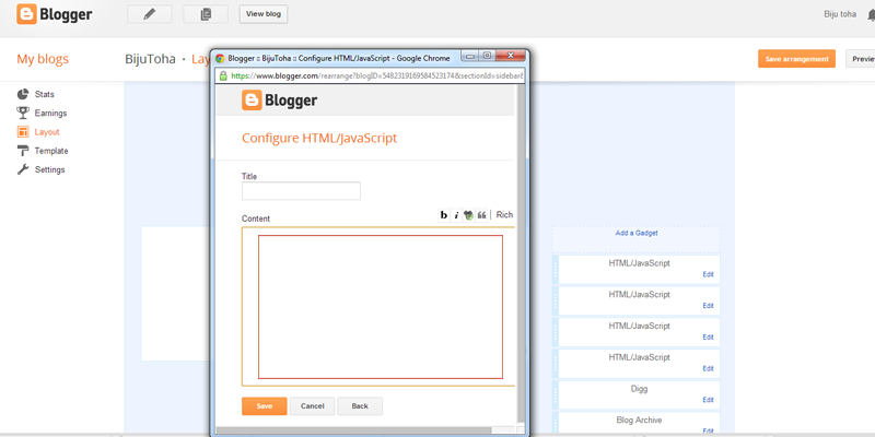 6. Copy "Second Code" then go to again Blogger Dashboard>Layout> then click Add a Gadget and select HTML/JavaScript..